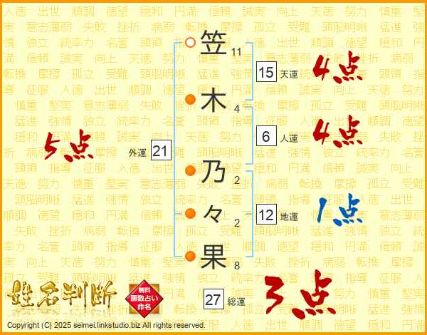 笠(11画)木(4画) 乃(2画)々(2画)果(8画)