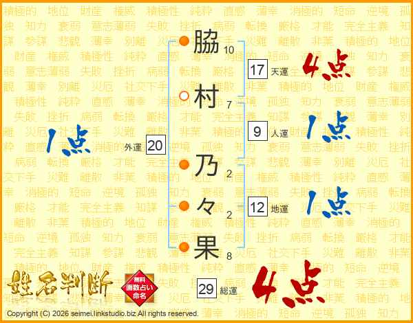 脇(10画)村(7画) 乃(2画)々(2画)果(8画)