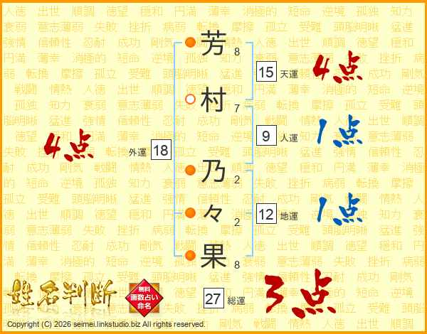 芳(8画)村(7画) 乃(2画)々(2画)果(8画)