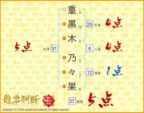 重(9画)黒(12画)木(4画) 乃(2画)々(2画)果(8画)