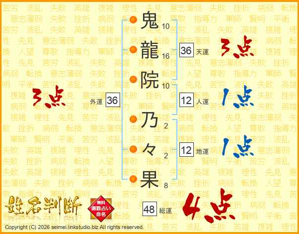 鬼(10画)龍(16画)院(10画) 乃(2画)々(2画)果(8画)