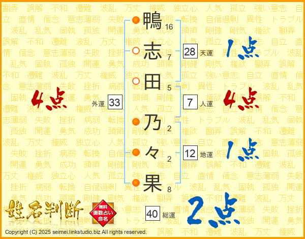 鴨(16画)志(7画)田(5画) 乃(2画)々(2画)果(8画)
