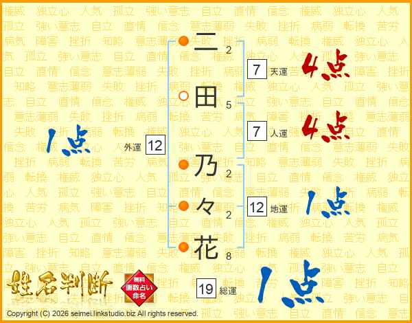 二(2画)田(5画) 乃(2画)々(2画)花(8画)