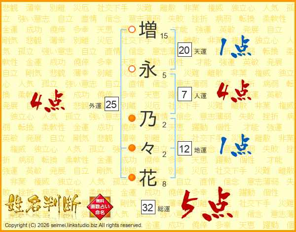 増(15画)永(5画) 乃(2画)々(2画)花(8画)