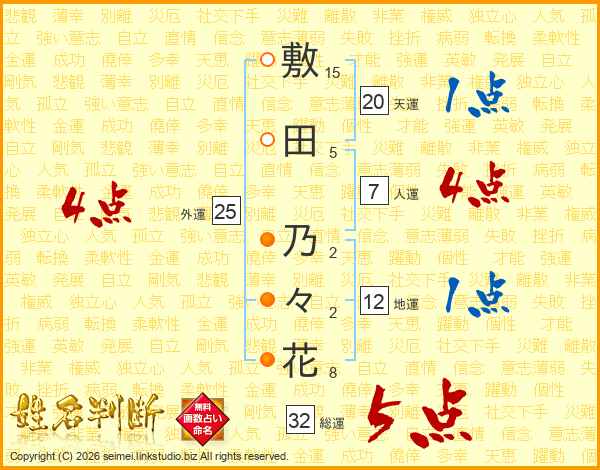 敷(15画)田(5画) 乃(2画)々(2画)花(8画)