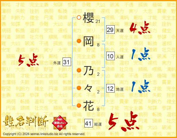 櫻(21画)岡(8画) 乃(2画)々(2画)花(8画)