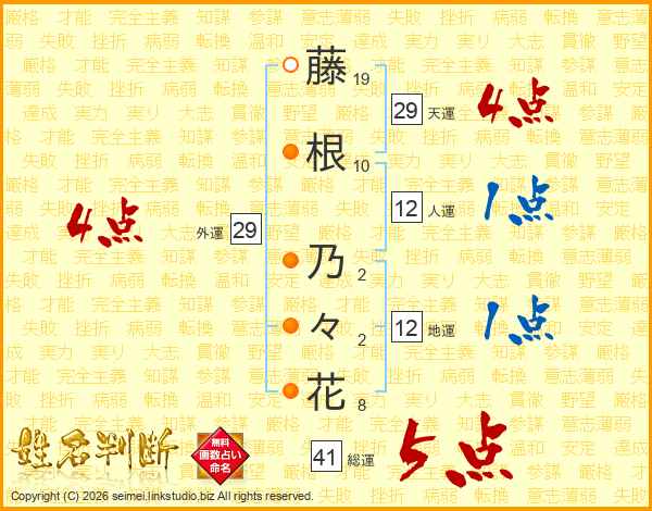 藤(19画)根(10画) 乃(2画)々(2画)花(8画)
