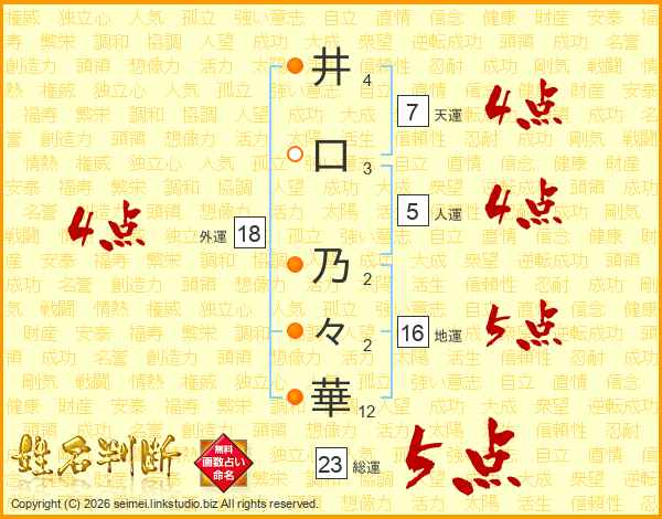 井(4画)口(3画) 乃(2画)々(2画)華(12画)