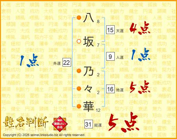八(8画)坂(7画) 乃(2画)々(2画)華(12画)