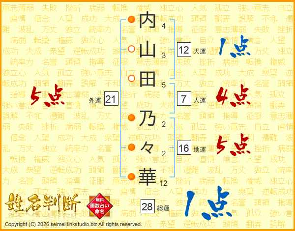 内(4画)山(3画)田(5画) 乃(2画)々(2画)華(12画)