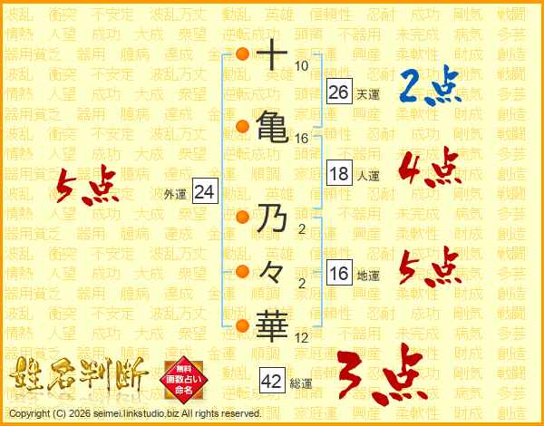 十(10画)亀(16画) 乃(2画)々(2画)華(12画)