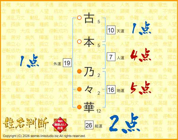 古(5画)本(5画) 乃(2画)々(2画)華(12画)