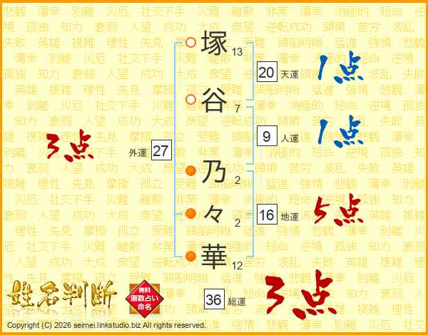 塚(13画)谷(7画) 乃(2画)々(2画)華(12画)