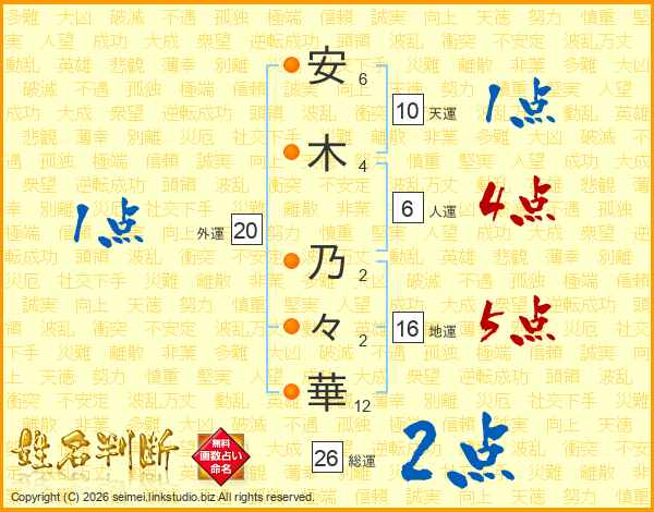 安(6画)木(4画) 乃(2画)々(2画)華(12画)