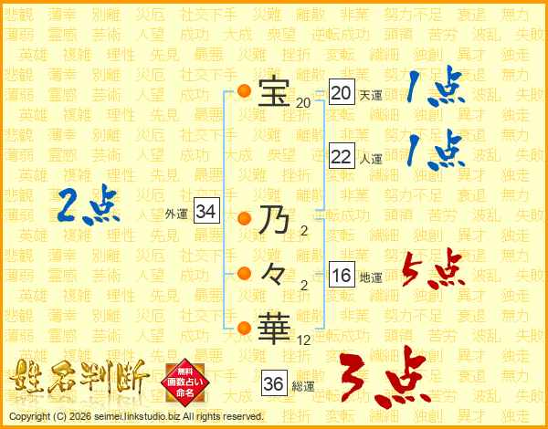 生活面を象徴する運勢です。外部から受ける影響力を表し、結婚運、家庭運や職場、環境への順応性を表します。総運から人運を引いた画数。姓や名が1文字の場合を除く。