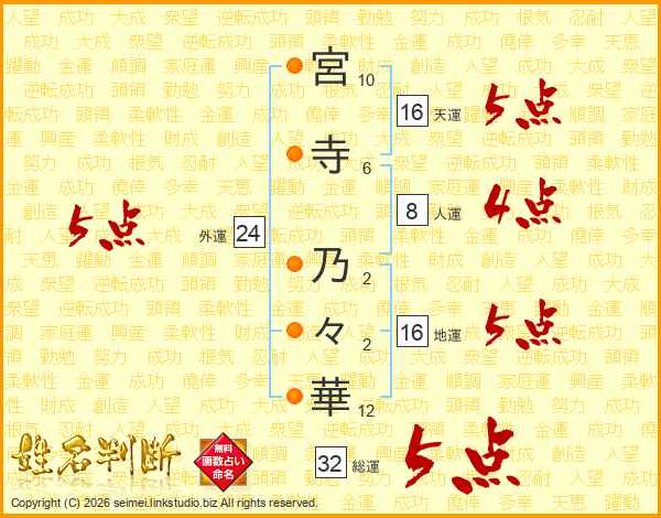 宮(10画)寺(6画) 乃(2画)々(2画)華(12画)