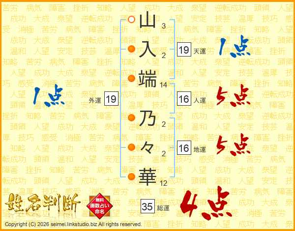 山(3画)入(2画)端(14画) 乃(2画)々(2画)華(12画)