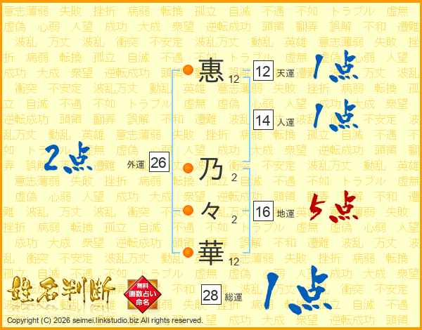 惠(12画) 乃(2画)々(2画)華(12画)