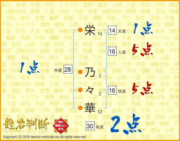 生活面を象徴する運勢です。外部から受ける影響力を表し、結婚運、家庭運や職場、環境への順応性を表します。総運から人運を引いた画数。姓や名が1文字の場合を除く。
