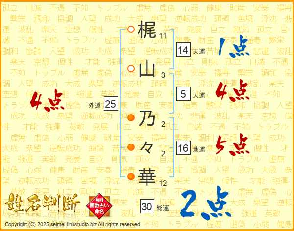 梶(11画)山(3画) 乃(2画)々(2画)華(12画)