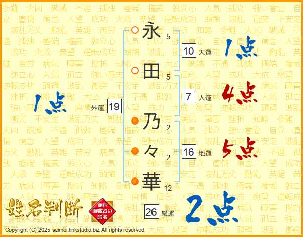 永(5画)田(5画) 乃(2画)々(2画)華(12画)