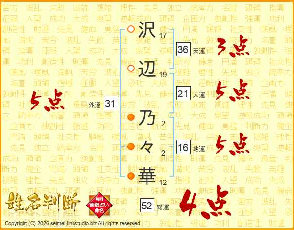 沢辺乃々華さんの総運は52画の4点!