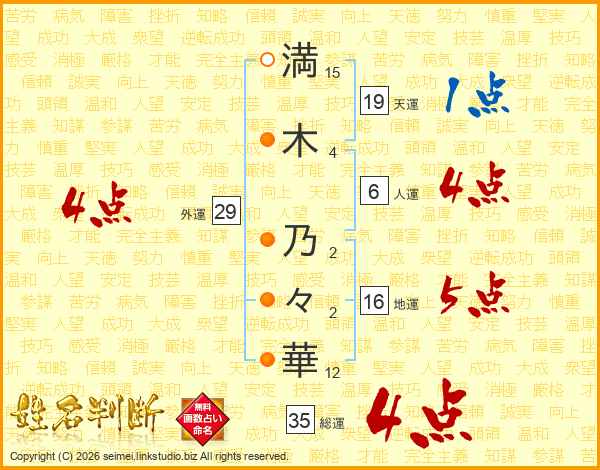満(15画)木(4画) 乃(2画)々(2画)華(12画)
