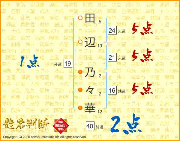 田(5画)辺(19画) 乃(2画)々(2画)華(12画)