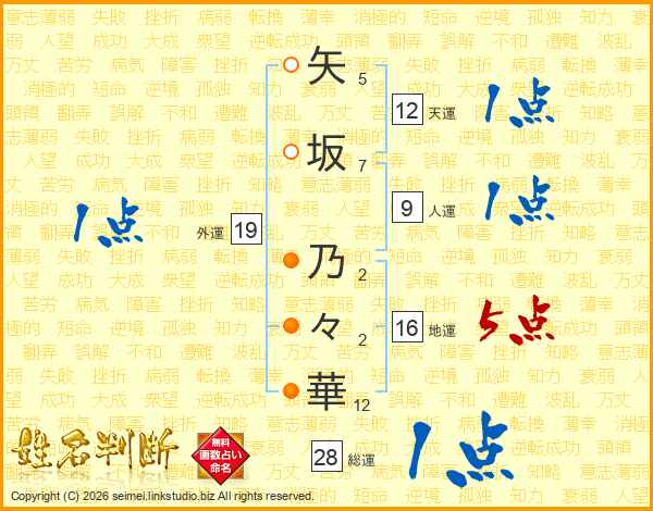 矢(5画)坂(7画) 乃(2画)々(2画)華(12画)