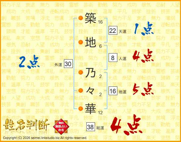 築(16画)地(6画) 乃(2画)々(2画)華(12画)
