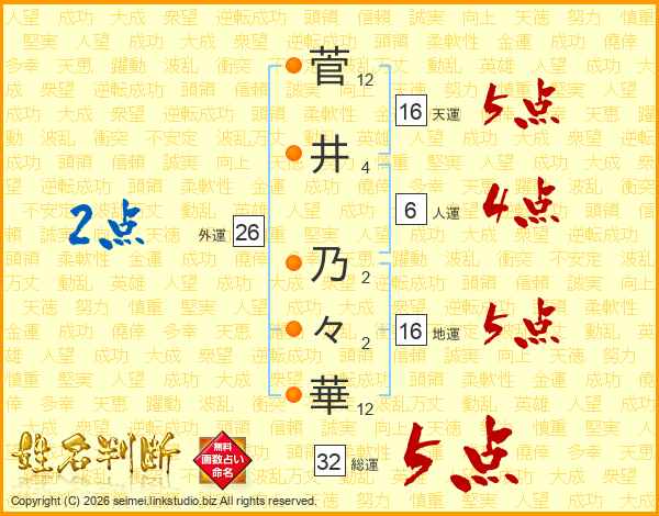 菅(12画)井(4画) 乃(2画)々(2画)華(12画)