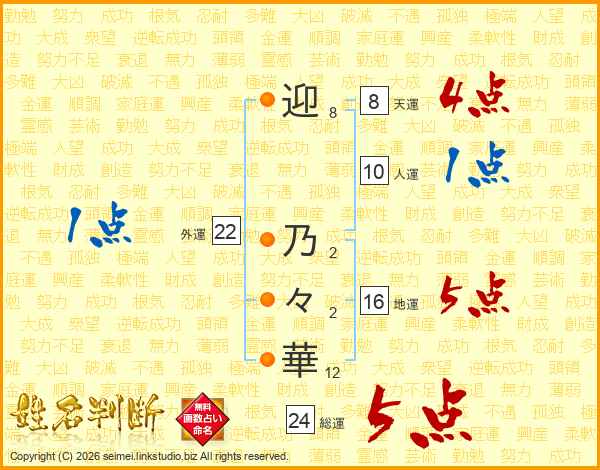 生活面を象徴する運勢です。外部から受ける影響力を表し、結婚運、家庭運や職場、環境への順応性を表します。総運から人運を引いた画数。姓や名が1文字の場合を除く。