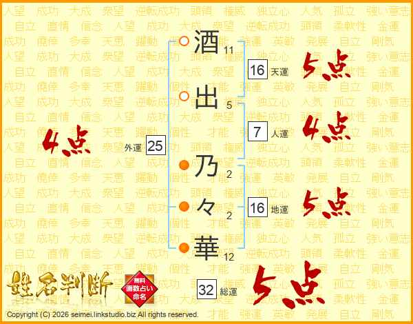 酒(11画)出(5画) 乃(2画)々(2画)華(12画)