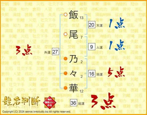 飯(13画)尾(7画) 乃(2画)々(2画)華(12画)