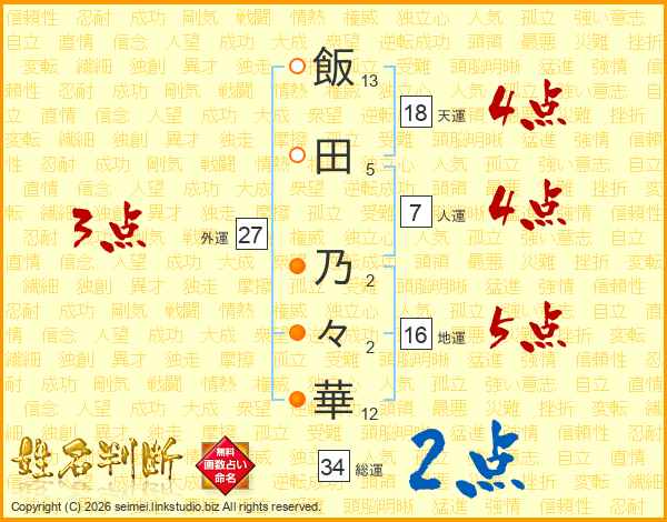 飯(13画)田(5画) 乃(2画)々(2画)華(12画)