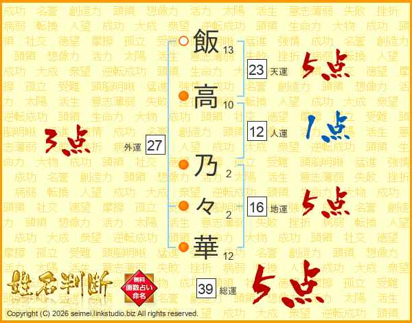 飯(13画)高(10画) 乃(2画)々(2画)華(12画)