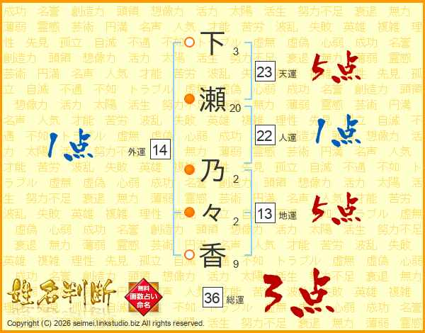 下瀬乃々香さんの天運は23画の5点!