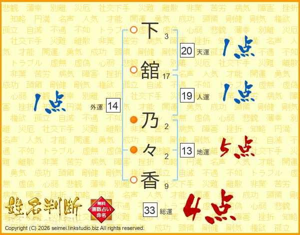 下舘乃々香さんの総運は33画の4点!