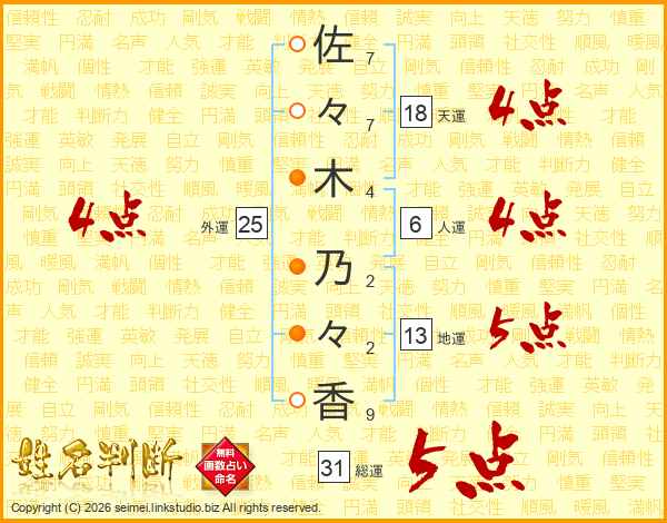 佐(7画)々(7画)木(4画) 乃(2画)々(2画)香(9画)