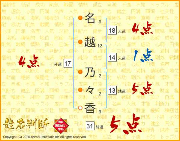 名(6画)越(12画) 乃(2画)々(2画)香(9画)