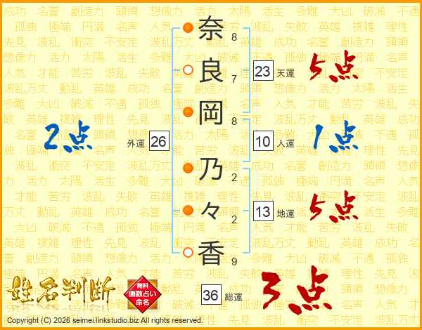 奈(8画)良(7画)岡(8画) 乃(2画)々(2画)香(9画)