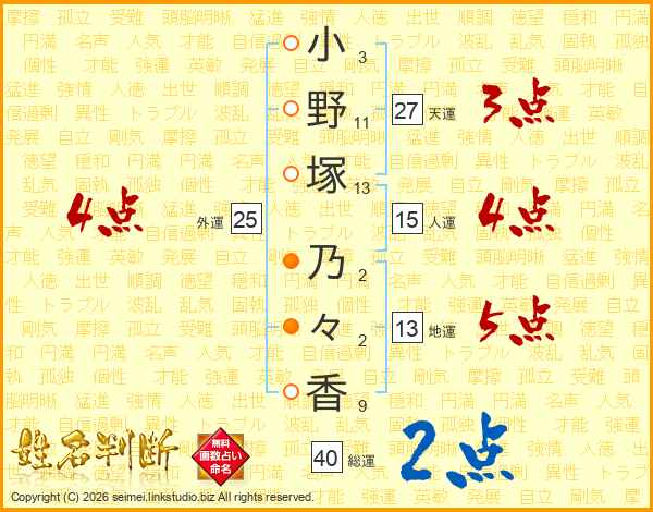 小(3画)野(11画)塚(13画) 乃(2画)々(2画)香(9画)