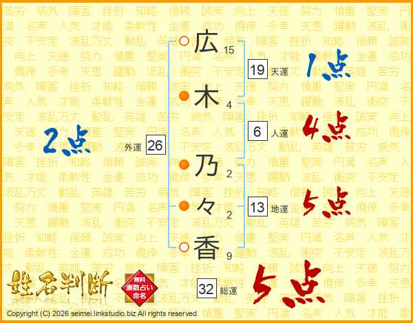 広(15画)木(4画) 乃(2画)々(2画)香(9画)