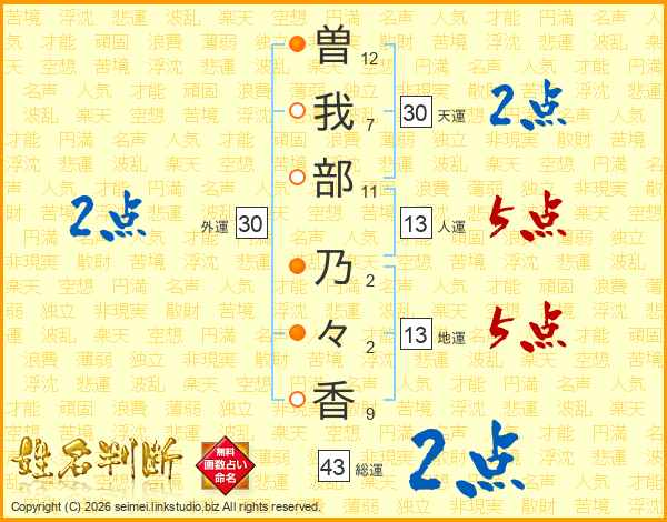 曽(12画)我(7画)部(11画) 乃(2画)々(2画)香(9画)