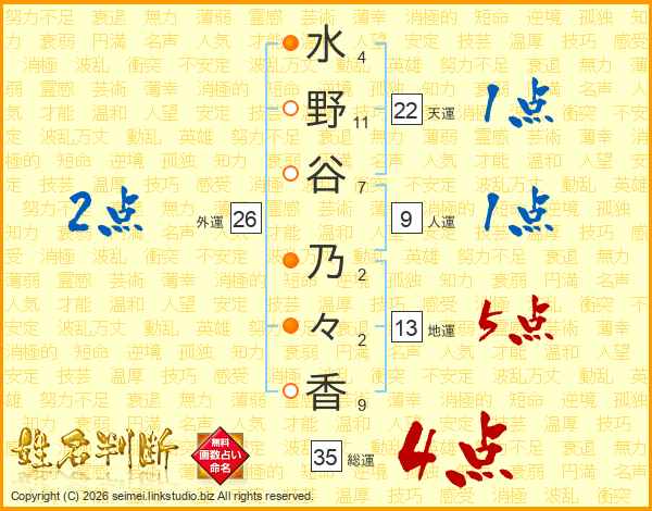 水(4画)野(11画)谷(7画) 乃(2画)々(2画)香(9画)