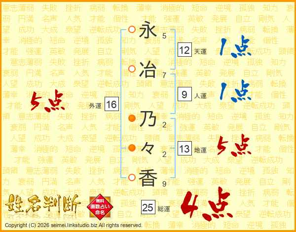 永(5画)冶(7画) 乃(2画)々(2画)香(9画)