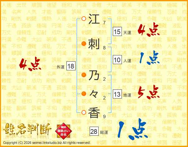 江(7画)刺(8画) 乃(2画)々(2画)香(9画)