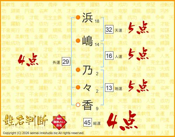 浜(18画)嶋(14画) 乃(2画)々(2画)香(9画)
