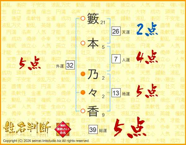 籔本乃々香さんの総運は39画の5点!