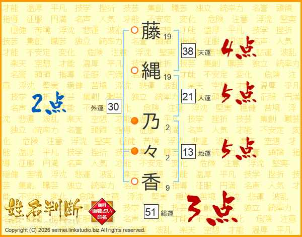 藤(19画)縄(19画) 乃(2画)々(2画)香(9画)